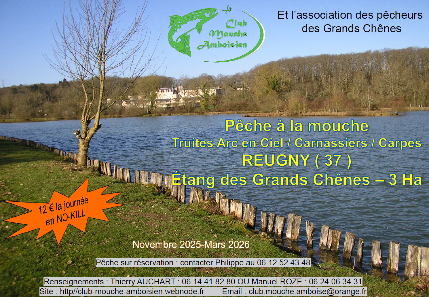 L'association "les grands chênes" et le club mouche Amboisien vous proposent un réservoir à truites de 3 hectares situé a Reugny au coeur de la Touraine, à 30 min de Tours, 40 min de Blois et 1 heure d'Orleans.